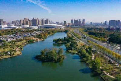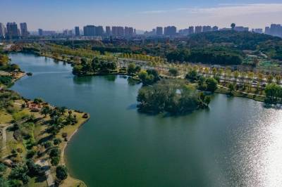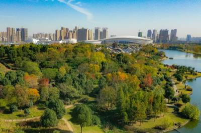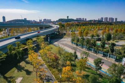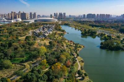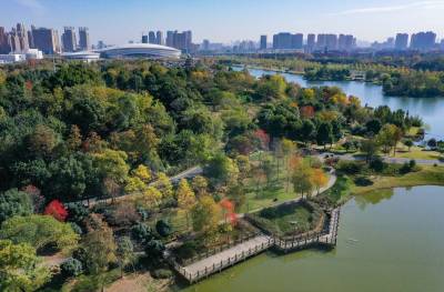 2021年11月23日,冬日暖阳,航拍镜头下的码头潭公园层林尽染,缤纷璀璨。 (湖北日报全媒记者 倪娜 摄)