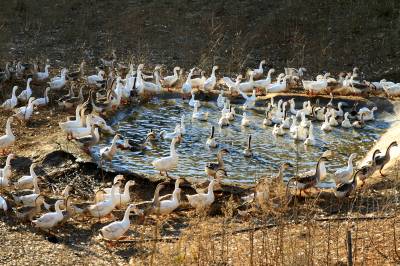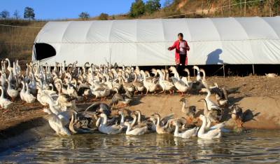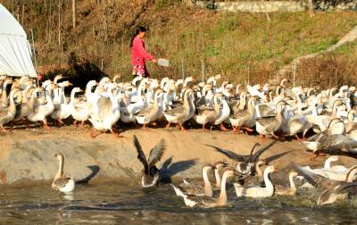 2021年11月24日,十堰市房县回龙乡古桥沟村村民在矮化银杏林下养鹅生态循环农业基地投食。房县引导村民发展低碳农业,利用森林草地资源优势开展林下养鹅、养鸡、养鸭。在树林里养殖家禽,鹅、鸡、鸭在树下啃食青草,可以有效遏制以杂草为食、栖身、繁衍的害虫,家禽食草后排泄的粪便经微生物发酵后又可被果树吸收,形成良好的动物——植物——微生物生态系统,提高土壤的肥力,形成了多重效益。据悉,该县林下养鹅、养鸡、养鸭已成为生态循环农业发展的助推器。