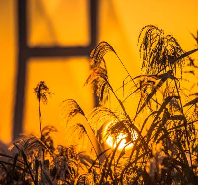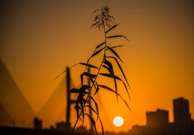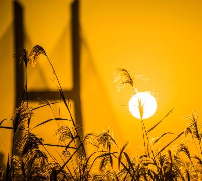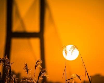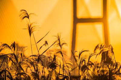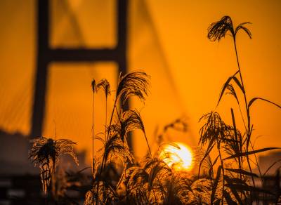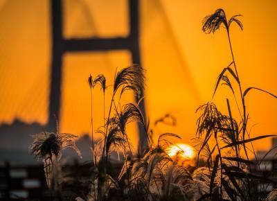 2021年11月25日,湖北武汉长江二桥在朝霞和芦苇的映衬下格外壮观。