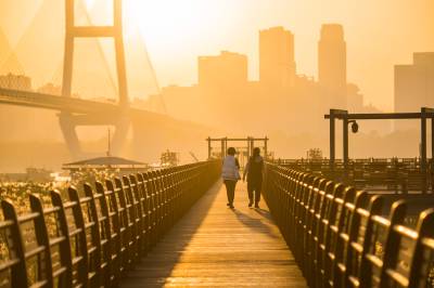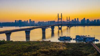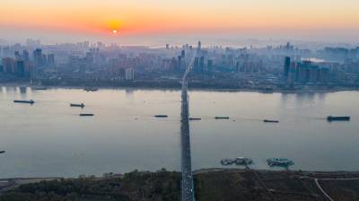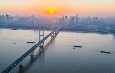 湖北武汉:朝霞映照武汉长江二桥美如画(客户端采稿)