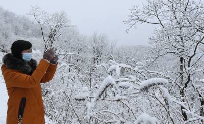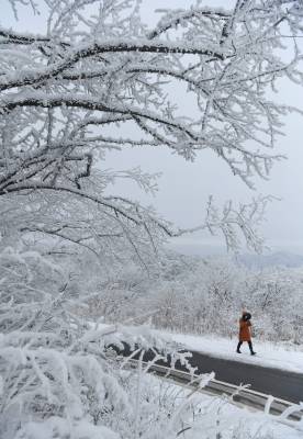 近日,平均海拔1700米的湖北省襄阳市保康县后坪镇横冲景区雪后出现雾凇景观,处处银装素裹,玉树琼枝,景美如画,美不胜收,吸引众多游客前来观赏。
