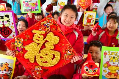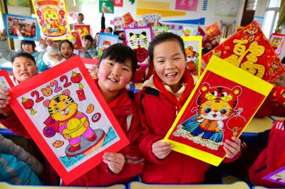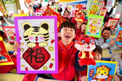 2021年12月29日,学生们在展示亲手创作和收集的有关"虎"的美术作品。