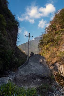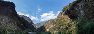 这条峡谷中的河流名叫“楼子岭”河,其实就是一条溪流,它位于湖北省恩施土家族苗族自治州巴东县溪丘湾乡的平阳坝,当地农民称之为“夹板溪”,溪口西岸为狮子垭村,东岸为营盘村。河岸两边,村民上世纪修筑的水渠依稀可见,如今已被饮用输水管道取而代之。这里海拔垂直落差大,石灰岩地层长期受水流冲蚀,溶洞、溶沟、地下河、干谷等喀斯特地貌发育完全,形成了许多奇特的自然景观。