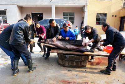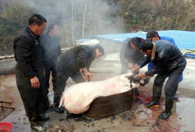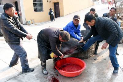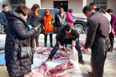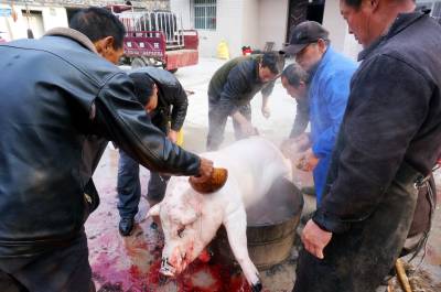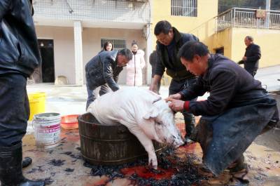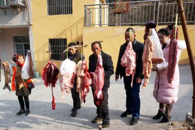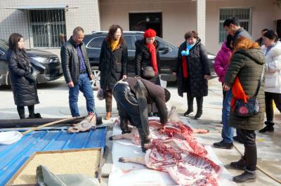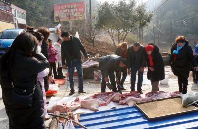 大柳乡饲养黑猪有几百年历史,由于当地黑猪独特的肉香,肉价每斤比城里贵2元,但城里人还要提前预约饲养,年前前来购买,否则是难得买到,特别是大柳乡每年一大半的黑猪肉被东风汽车公司(原第二汽车制造厂)的员工定购买走了。今天我来的早,选定一个猪头,三副大肠,20斤猪肉。可是等到杀第三头黑猪时,市区里赶来的6辆轿车带来老老少少20多人,老少媳妇们风扫残云,买年猪肉变成了抢购,这里尤如战场,谁抢的是谁的,等我反应过来为时己晚,留下的猪头被她人提走,留下的3副大肠只抢到了一副,说好的年猪也被她们占为己有,没我什么事了。只得转着玩去了,玩了一会小孙来电话多出一块肉快过去过秤,终于买了一块19斤的包饺子的黑猪肉,吃完杀猪宴付完钱只得驱车回城,原打算买1000多元的年猪肉,最后只花了383元钱,扫兴而归,这次终于让我领教了什么叫娘子军,什么叫妇女也是半边天。