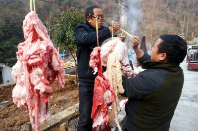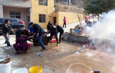 2022年1月2日,十堰市郧阳区大柳乡十字沟村3组村民孙相清家杀年猪,今天他家要杀3头380多斤的黑猪,按照去年杀年猪的约定,一大清早吃过早饭就驱车向山里进发,不到九点就来到孙相清家门口,由于大柳乡海拔平均在800米以上,门口杀猪流出的水迅速结冰,而孙相清家的年猪己经杀了2头,前面杀年猪没有拍到,只能等到拍摄杀最后一头年猪了。
