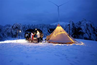 春节期间,百里荒景区开展了雪地露营体验、赏雪景、创意堆雪人大赛、迷你冬奥表演、夜滑烟花秀等节庆活动,并推出“助力冬奥滑雪优惠券”“景区门票半价”等惠民活动,吸引了大批“玩雪”爱好者和以家庭游、亲子游为主体的群体前来打卡,吸引了宜昌、武汉、荆州、荆门等地滑雪爱好者慕名前来体验,一起为冬奥加油!