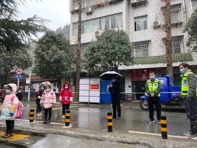 校领导、值日教师、校园义警组成护学岗,分布在校门口和校园周边。在周边,义警们负责疏导车辆,防止车辆无序停靠、人车混行及车辆长时间滞留等影响师生安全出入问题;校门口,老师为学生测好体温后,迎进学生。带着满满的安全感,同学们背着书包,戴着口罩,保持间距,接受体温检测后,有序踏进校园。