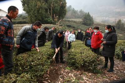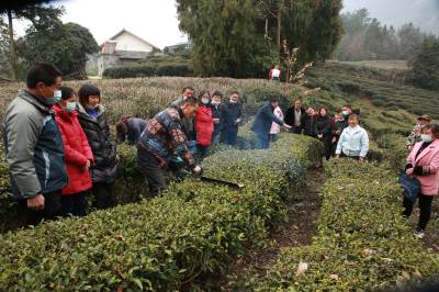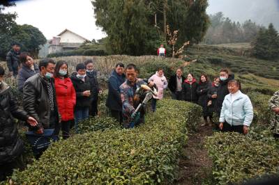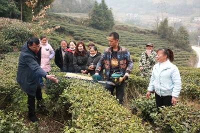 2月28日,在巴东县金果坪乡沙岭村八组王学才茶园里,巴东县易达职业技术学校的讲师正按照“点菜式”培训清单详细讲解茶叶春管技术要点,现场示范机械修剪、掏沟施肥技术。