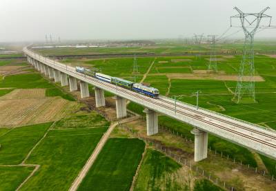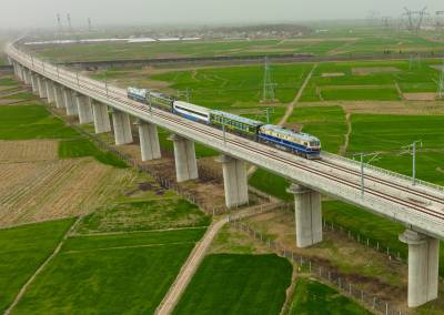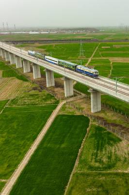 3月1日,湖北省襄阳市,在襄城区欧庙镇,检测车行驶在位于郑万高铁线路上。
