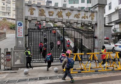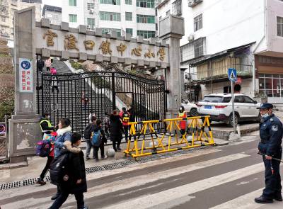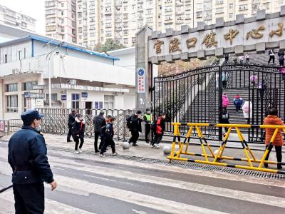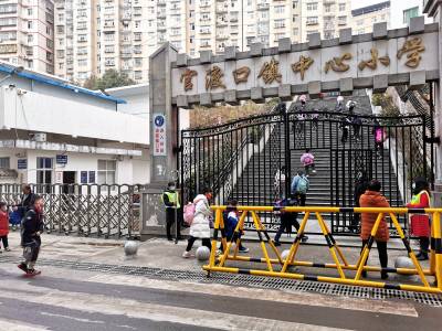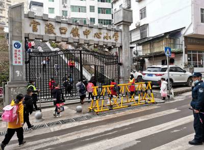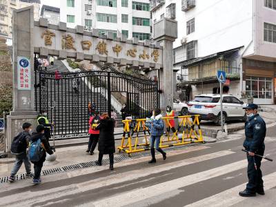 官渡口镇中心小学 家校联动育幼苗 3月2日,巴东县官渡口镇中心小学学苑路校门口学校保安、学生家长手执钢叉、橡胶棒等器械维护学生上学安全。