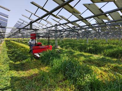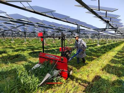观音村同景20MWP“农光互补”光伏电站占地面积500余亩,采用支架安装不打桩,光伏板离地3米高,支架行距8米宽,板下农田可供大型农机作业;采用跟踪技术使光伏板“跟着太阳走”,能让阳光移动照射有效促进农作物生长,实现“空中光伏发电,地上高效农业”立体产出效益。