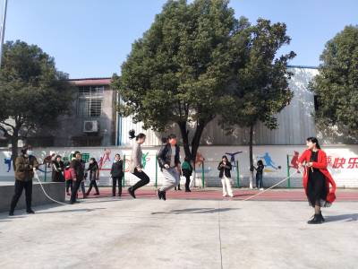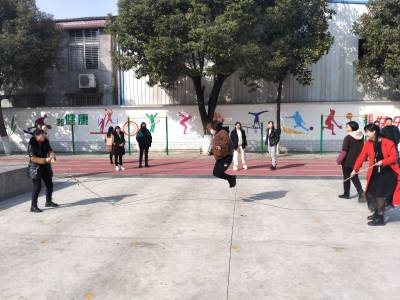 老师们一扫平日的矜持和安静形象,放松心情,参与比赛。单人跳、双人跳、多人跳。一个个腾空跳跃的身影,给宁静的校园添加了一道靓丽的风景线。观看比赛的老师谈笑风生,其乐融融。女教师们在一片沸腾的气氛中感受着节日里运动带给他们的快乐。