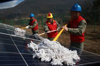 3月9日,国网巴东金果坪供电所共产党员服务队和鄢家墩村新时代文明实践站队员来到鄢家墩村光伏电站,清理该站光伏板表面污垢。
