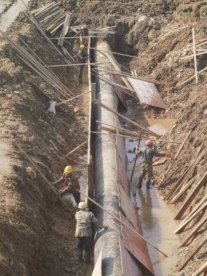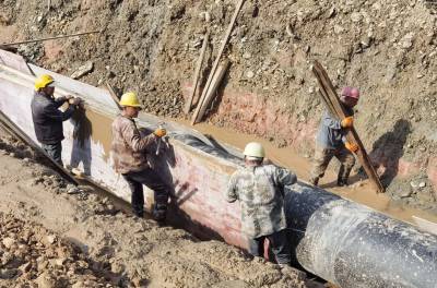 2022年3月9日,施工人员在铺埋十堰市房县方家畈水库水厂饮水管道。房县方家畈水库水厂引用方家畈水库优质水源并经过净化处理,向3个乡镇和城区群众供应卫生安全的自来。该水厂供水规模达2万吨/日,受益群众20万人。近年来,当地按照“水源保护、水量保证、水质合格、管理保障”的巩固提升目标,通过新建、改造、联网、配套农村供水工程等措施,加大实施农村饮水安全巩固提升工程,让广大群众喝到放心水、安全水。