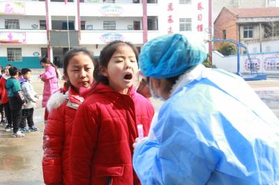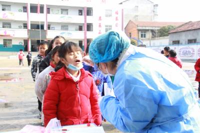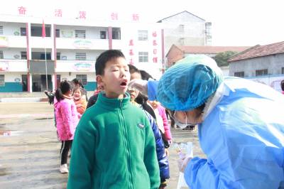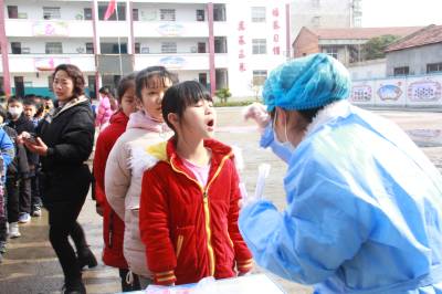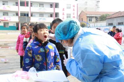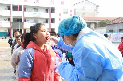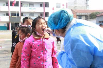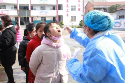 3月23日,安陆市王义贞镇中心小学,镇卫生院医务人员在该校采集咽拭子,对师生进行全员核酸检测。目前,国内疫情零星散发,为阻断疫情蔓延,有利于精准防控,对疫情风险进行科学评判,该市新冠肺炎防控指挥部决定对全市市民每天进行全员核酸检测。图为王义贞镇中心小学核酸检测现场。
