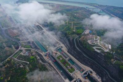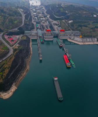 3月23日位于宜昌市夷陵区太平溪镇的三峡大坝南线船闸恢复运行,满载货物的船舶正在通过三峡大坝五级船闸,这标志着三峡船闸全部恢复双线运行。