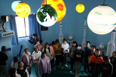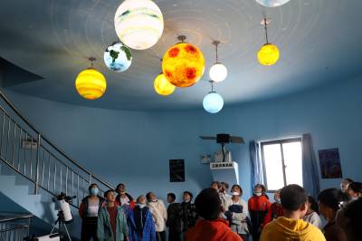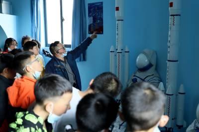 3月23日下午,在宣恩县教育中心天文台,学生们在老师的介绍下查看长征系列运载火箭模型。 当天,宣恩县第四民族实验小学50余名师生走进宣恩县教育中心天文台,与射电望远镜、古今天文观测仪、神舟六号返回舱模型等设备零距离接触,感受天文知识的魅力。 近日,该校组织开展“致敬中国航天 筑梦星辰大海”主题教育活动,通过召开主题班会、参观天文台、观看天宫课堂、阅读天文科普图书等方式,让学生们学习航天知识、探求宇宙奥秘。