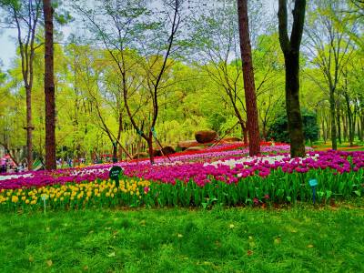 郁金香争妍樱花园 3月27日,难得日暖人间,武汉樱花园不仅仅樱花潮湿人的悦心,其海样的郁金香毫不逊色,它既艳色袭人又芳香扑鼻。如果你以为我在夸大其词,请来身临其境体检一下吧!