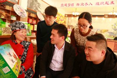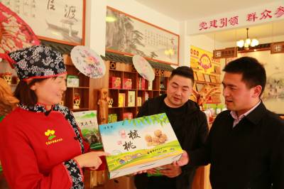 3月28日,竹山县官渡镇桃园村党支部书记张林正在村合作社农产品展馆向游客推介合作社生产的“山货”。近年来,官渡镇桃园村采取“以村带社、村社一体、利益联动、共建共享”和“合作社+基地+农户”的发展模式,发展竹笋、山野菜、核桃、蜂蜜、木耳、香菇等有官渡地方特色的旅游商品,通过线上+线下网络直销平台,将桃园村打造成农文结合、农旅结合的乡村旅游与生态休闲产业带,带动全村124户农民脱贫致富。