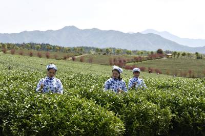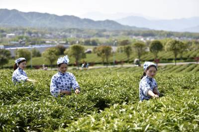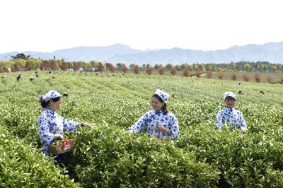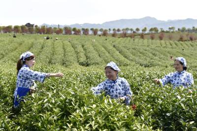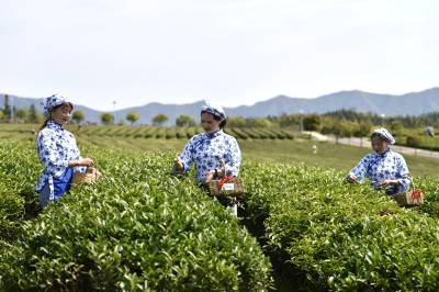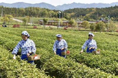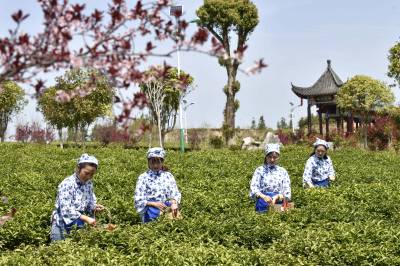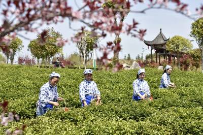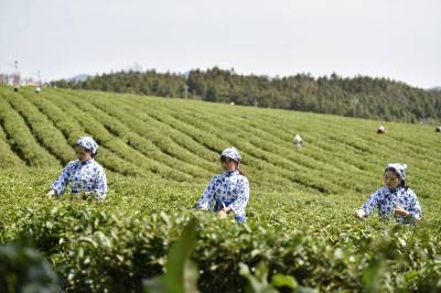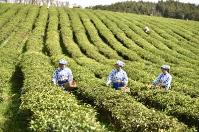 2022年3月29日,湖北省咸宁市通城县沙堆镇九井峰茶文化品赏园,茶厂员工在采摘明前茶。 通城县福人企业投资打造的万亩九井峰茶文化品赏园,以茶带旅、以旅兴茶,已成为湘鄂赣周边游客茶园观光和茶文化体验打卡地,同时带动周边3个乡镇数百村民种茶,采茶致富,助力乡村振兴。
