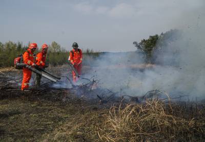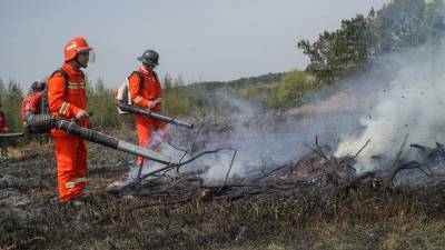 3月29日上午10时,在湖北省应城市国有林场总场七屋工区,开展森林防火演练,林场专业扑火队员16人参加演练。