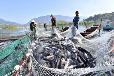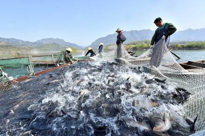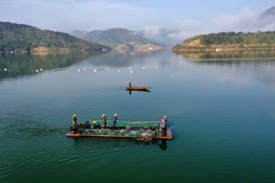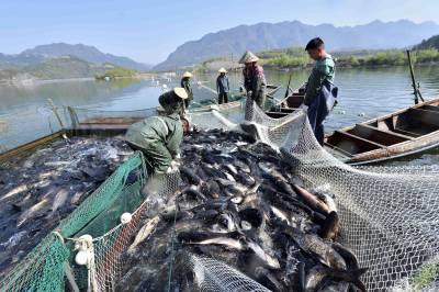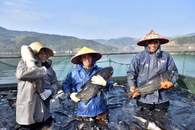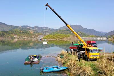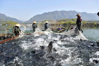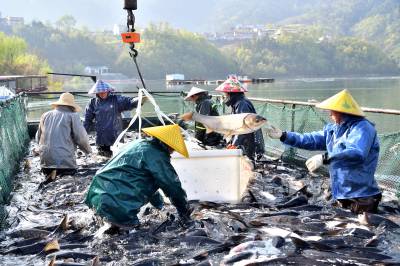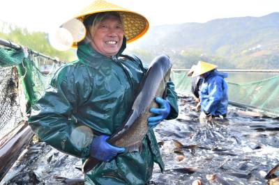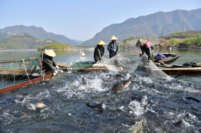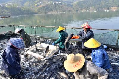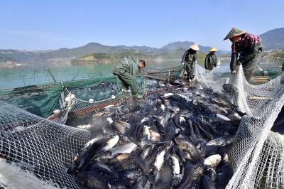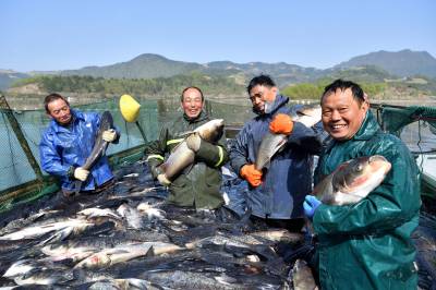 当日,保康县寺坪镇南河渔业农民专业合作社的渔民春捕开网,渔民们忙着捕捞、分拣、收网、装车,对外销售,供应市场。