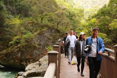 3月29日,数十名的游客前来竹山县官渡镇武陵峡风景区探秘武陵峡,寻梦桃花源,这是近两年疫情过后迎来的第一批客人。