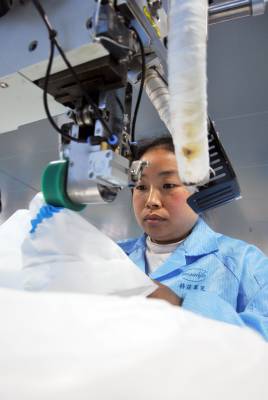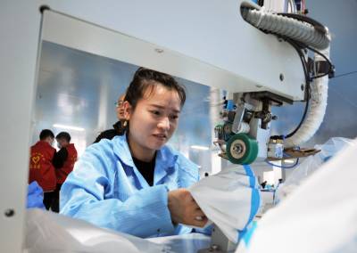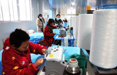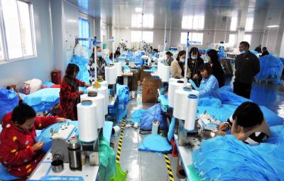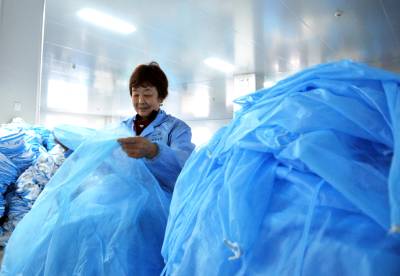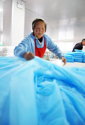 3月30日,湖北巴东格兹莱芙有限公司五十余名工人在生产、包装、赶制医用一次性防护服、手术衣和鞋套等订单。 据悉,自今年正月初十以来,湖北巴东格兹莱芙有限公司不断收到国内6万只医用鞋套、14万件手术衣和欧美2万件防护服三大订单,为了按时保质交货,员工们加班加点,开足马力生产。目前,时间过半,任务已完成三分之二,生产的产品经检测质量均达标。(视界网 梁勇 谭平 摄)