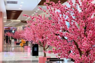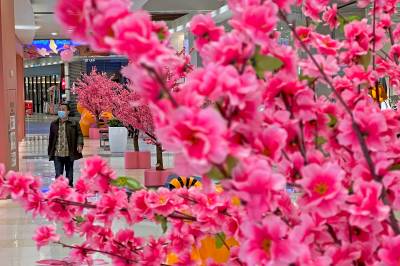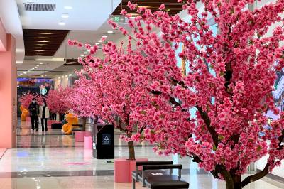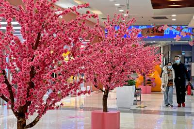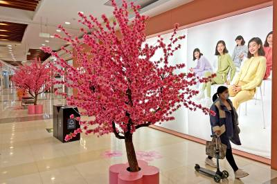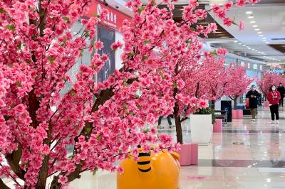 2022年2月28日,在武汉市东西湖区金银潭永旺,市民从仿真桃花树旁经过,仿佛置身“桃花源”。连日来, 武汉气温持续升高,春天来临,武汉各大商圈也相继推出春日商品,春季新品服饰和美食,打造各种春天主题造景,让市民沉浸在商圈里的春天,拉动春季消费热。 (湖北日报全媒记者 倪娜 摄)