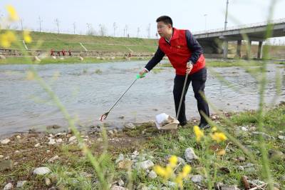 图二:2022年4月1日,湖北省十堰市房县县委书记、总河长纪道清带头在大河城区段捡拾白色垃圾。