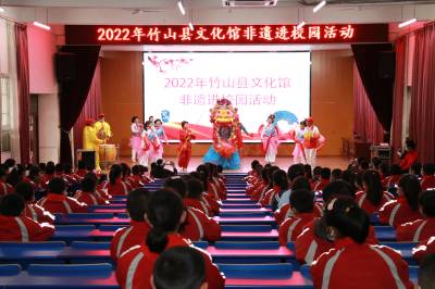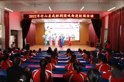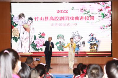 在当天的活动中,县高腔剧团的戏曲艺术家为学生们普及了戏曲的相关知识、介绍了各种戏曲中的角色以及装扮,还为全校师生带来了精彩的戏曲表演,现代豫剧朝阳沟选段《双上山》、竹山高腔《露肚脐的新媳妇》、《见面礼》选段、戏曲《红菊》选段等,赢得了全场老师和学生的阵阵掌声。其中,豫剧《红菊》取材于周大新的小说《左朱雀右白虎》,讲述抗日战争时期,一群普通老百姓为保护汉墓与日寇进行殊死抗争的感人故事,现场给孩子子们讲述了感人老百姓抗日故事,戏曲表演身段惟妙惟肖,一招一式,将现场同学们个个观看地津津有味,聆听得聚精会神,艺术家们精彩的表演、极富感染力的唱腔赢得师生阵阵喝彩。与此同时,县文化馆联合县高腔剧团还开展了非遗进校园活动。