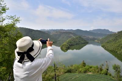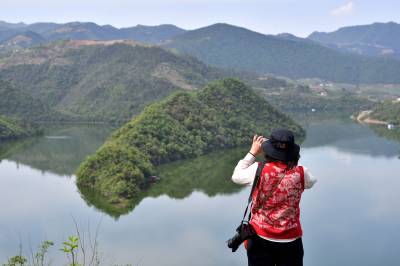 近日,保康县寺坪镇天子湖碧水如镜,青山浮水,倒影翩翩,绿水青山美景如画,吸引游客前来观赏游玩。