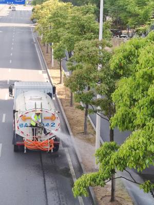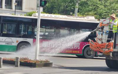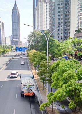 4月8至10日的武汉市,四月的春天有点似夏天,最高气温已达31℃以上,街头树木花草直喊"渴"。连续三天来,江汉区园林局园林绿化队绿化工们,冒着高温在辖区的街头及时为树木花草浇水解渴,确保它们正常生存不受影响。