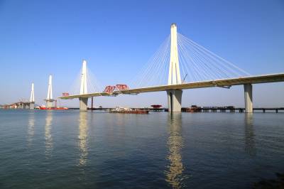 金海大桥是珠三角入海口上建设的第一座公铁两用大桥,主桥为挑臂式钢箱梁多塔(4塔)公铁同层斜拉桥,桥长1369m,桥跨布置为(58.5+116+3×340+116+58.5)m;桥宽49.6m,中间通行双线160km/h城际铁路,同层左右两侧通行六车道100km/h高速公路。是世界首座公铁同层多塔斜拉桥,也是目前世界上最宽公铁两用斜拉桥。