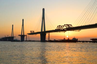 26号墩共有6块标准钢箱梁,标准钢梁长均为24米,宽50.2米,单重约680吨,采用750吨架梁吊机吊装。边跨钢梁合龙后,将26、27号墩3台架桥机整体转场到28、29号墩,开始大桥新一轮标准钢箱梁架设工作。全桥标准钢箱梁36块,合龙块3块。