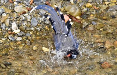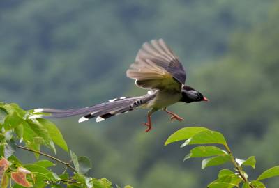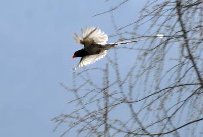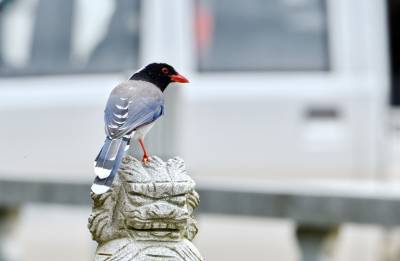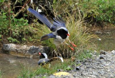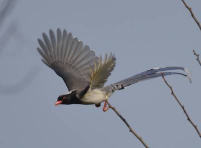 拉丁学名:Urocissa erythrorhyncha。留鸟。为雀形目、鸦科、蓝鹊属、红嘴蓝鹊种。体长51-65厘米,体重150--210克。雌雄羽色相似,嘴、脚红色,头、颈、喉和胸黑色,头顶至后颈有一块白色至淡蓝白色或紫灰色块斑,其余上体紫蓝灰色或淡蓝灰褐色。尾长呈凸状具黑色亚端斑和白色端斑。下体白色。