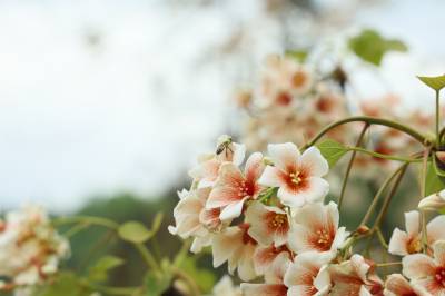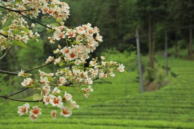 每一朵桐子花都晶莹剔透,白晰似玉,令人赏心悦目。谷雨后,很多花逐渐凋谢了。这时,一簇簇白里透红的桐子花在绿色的茶垄中无声无息地开放,在微微太阳光的照射下,婀娜多姿。