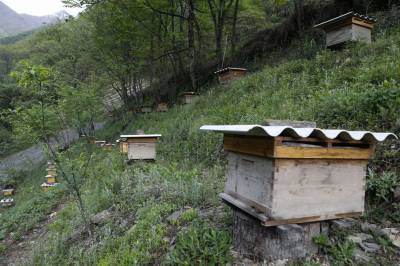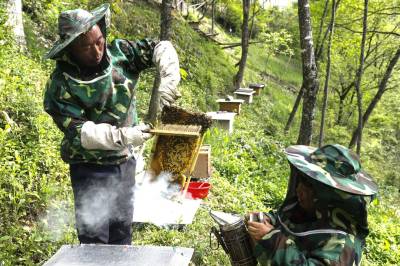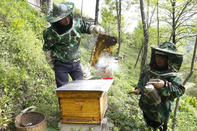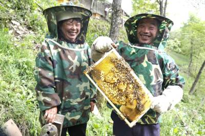 堵河源保护区枪刀山境内有丰富的蜜源植物,董承堂夫妇俩从2014年开始,在自家房前屋后的树林里摆放3个蜂桶尝试林下养蜂,当年收获的蜂蜜只够自家食用。后来的几年里,他们逐步掌握养蜂与采蜜技术,觉得养蜂能增加收入和乐趣,便继续扩大养蜂规模,目前已发展到81桶,去年采收蜂蜜500多斤,收人超过5万元。(视界网程平 施维华摄影)