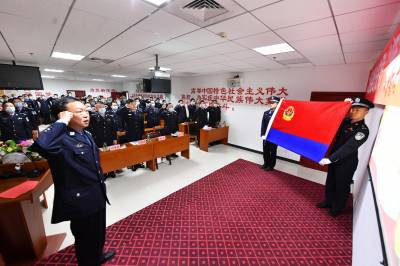 “我是中国人民警察,我宣誓:坚决拥护中国共产党的绝对领导,矢志献身崇高的人民公安事业,对党忠诚、服务人民、执法公正、纪律严明,为捍卫政治安全、维护社会安定、保障人民安宁而英勇奋斗!”新老民警举起右手庄严宣誓,铿锵有力的誓言在警旗前久久回荡。