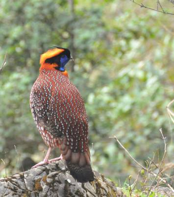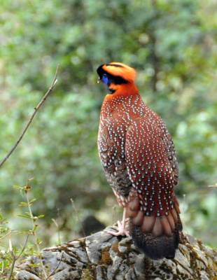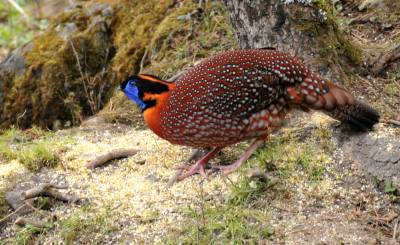 拉丁学名:Tragopan temminckii。留鸟。为鸡形目、雉科、角雉属、红腹角雉种。中国《国家重点保护野生动物名录》二级 。体长44-66厘米,体重930-1800克。体羽及两翅主要为深栗红色,满布具黑缘的灰色眼状斑,下体灰斑大而色浅。在头顶上生长着乌黑发亮的羽冠,羽冠的两侧长着一对钴蓝色的肉质角,精巧而美丽,这就是“角雉”名称的由来。