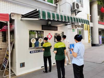 5月30日,在竹山县疾控中心门口的“核酸检测便民采样点”小亭子前,等待检测的人员排着队、有序保持“一米线”,扫描“健康码”或身份证,医生通过外壁玻璃孔上的防护手套伸出手来,轻松完成了“无接触式核酸检测”,医护人员每测完一人即消毒双手,旁边还有工作人员不时喷洒消毒,全程快捷、安全。据悉,这个采样点是城区设置的3个免费核酸采样点之一。