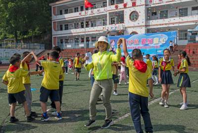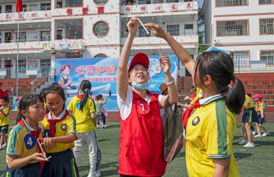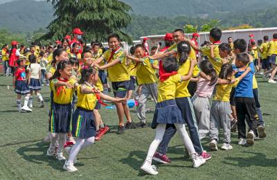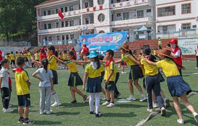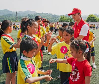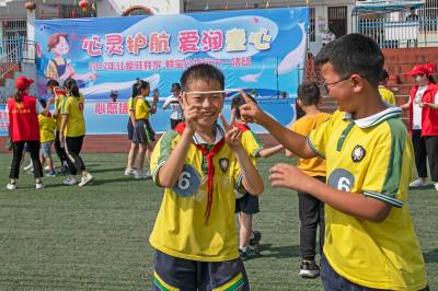 2022年5月31日,湖北省宜都市潘家湾土家族乡中心小学的学生在志愿者的陪伴下愉快地做着各种游戏。当天,宜都三江文旅公司的60多名志愿者携手两名儿童心理辅导老师,专程来到潘家湾中心小学,和该校的小学生一起,开展“心灵护航、爱润童心”为主题的爱心陪伴活动,并专门为该校学生设计了“蝙蝠抓飞蛾、贪吃的蛇”等游戏,让孩子们在协同配合、精诚团结、相互陪伴中,体验到无穷的快乐。