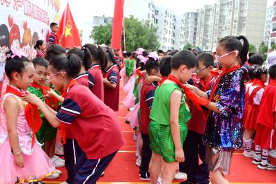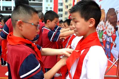 在“六一”前夕,该校各中队组织学生认真学习队章、唱少先队队歌、学习红领巾相关知识后,经本人申请,各中队推荐,学校少先队大队部审核报德育处批准,该校325名学生光荣入队,正式加入中国少年先锋队。入队仪式上,他们佩戴领巾、宣誓、呼号,系上了人生第一颗纽扣。