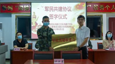 活动现场,县文化和旅游局与武警湖北总队宜昌支队执勤六中队签订了军民共建协议书,县图书馆向武警中队图书室捐赠图书200册。