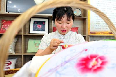 2022年6月7日,宜昌市夷陵区太平溪镇许家冲村“三峡•艾”手工基地工人在缝制手工绣品,准备发往全国各地。宜昌市夷陵区太平溪镇许家冲村被誉为“坝头库首第一村”,有着靠近三峡大坝的独特禀赋。村民谢蓉是当地的产业致富带头人。2012年,她牵头组建宜昌绣女工艺品专业合作社,之后又成立宜昌沁邑民俗文化有限公司,创立“三峡•艾”特色品牌,传承峡江绣艺“牵花绣”,发展手工刺绣产品,将特色手绣与艾草相结合,与北京一家公司合作进军网络市场,通过互联网销往各地,带领一大批赋闲在家的移民妇女灵活就业。(视界网 张国荣 摄)