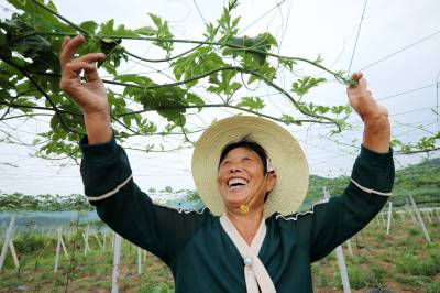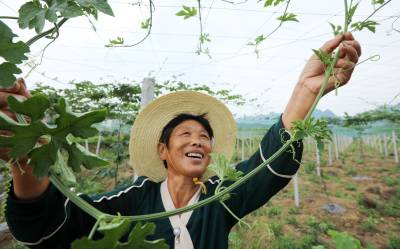 2022年6月11日,十堰市房县军店镇中村中药材基地,农民在疏理攀爬棚架上的吊瓜藤蔓。房县是华中地区中药材生长最佳区域,素有“华中药库”之称。近年来,该县通过公司资金、技术和管理优势,辐射带动乡村、合作社、农户发展地道中药材,形成了中药材育苗育种、药材种植、药材精细加工全产业链,为促进乡村振兴筑牢了支柱产业的基石。迄今为至,当地中药材种植面积超过50万亩,精加工的北柴胡、白芨、绞股蓝、虎杖通过国家地理标志产品认证,中药材制成片剂、胶囊、注射液等产品远销日本、韩国、越南等“一带一路”17个国家和地区,有效带动农民增收致富。
