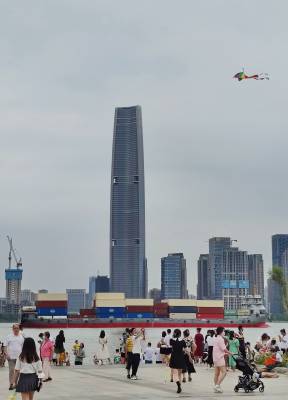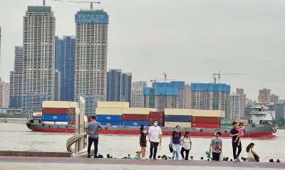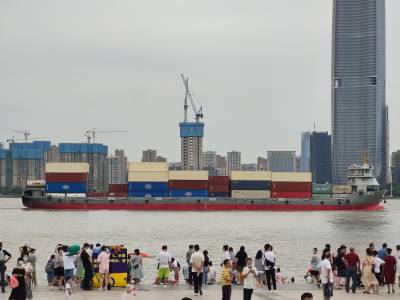 6月11日,武汉汉口江滩三阳路广场旁,在长江江水上涨中,有一艘集装箱货轮在水涨船高的黄金水道中航行,给逛江滩的市民游客身临其境的感受,格外引人注目。