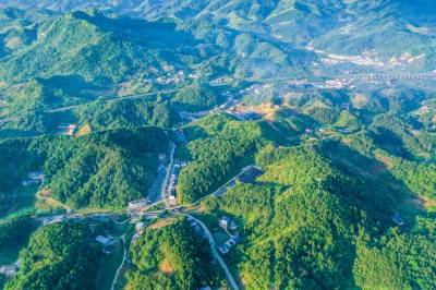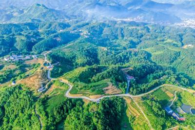 2022年6月29日,在竹溪县水坪镇纪架山拍摄的麻安高速,346国道及县乡农村公路纵横交错镶嵌入绿色大地的生态环保路网图。