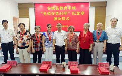 局党组为六名老党员颁发了“光荣在党50年”纪念章。广大老党员是谷城教育发展的亲历者、参与者和见证者,他们用实际行动践行初心使命,赓续光荣传统,传承精神谱系。局党组还借此机会组织老党员们参观县一中迁建现场、县第二实验小学等,让老党员感受谷城教育的发展成就。