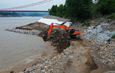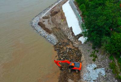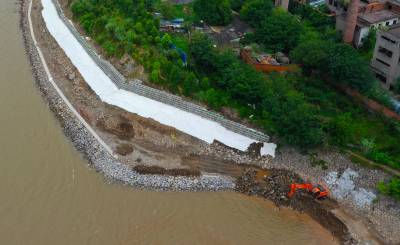7月3日,位于葛洲坝泄洪闸下游长达3.2公里的宜昌市西陵区西坝街办的“西坝长江岸线治理工程”多台大型挖掘机正在沿途回填施工,岸线治理轮廓初现。目前,已经完成工程总量的60%。治理工程采取护坡回填、生态框浆砌、植树绿化等方式进行生态修复。消除了因大水冲刷、年久失修造成的长江护岸初现掏空层和部分坍塌的安全隐患。该工程竣工后将对中华鲟回游繁殖、江豚聚集提供安全生存环境。同时西坝将形成长江护岸360度硬化、美化,宜昌又多了3.2公里的沿江观景带。视界网黄善军摄